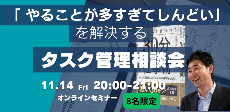 激務の大手金融機関で残業ゼロの働き方を達成し、『細分化して片付ける30分仕事術』をはじめ、 3冊の本を出版したタスク管理の専門家の立場から、あなたの悩みを解決します。